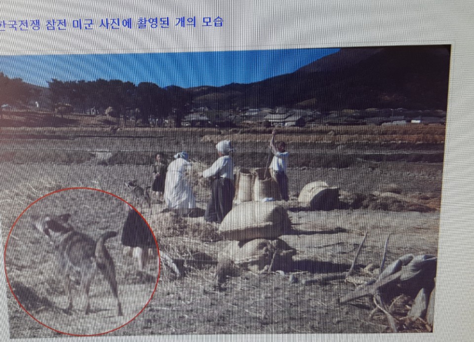 이 사진은 북한 주민들이 논에서 타작하고 있는데 재구 풍산개의 모습이 보입니다.