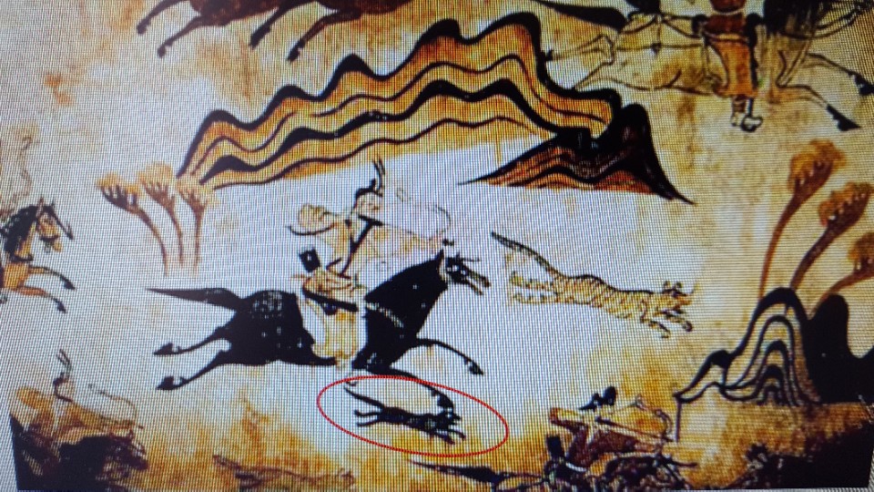 이 그림 민화는 고려시기에 관가의 생활 풍경인데 검정개 한마리가 주인과 함께 동행하고 있다.