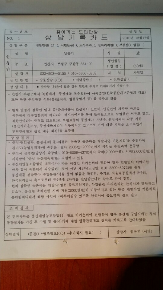 경기도청 민원 조사 결과가 안성 풍산개 마을 이장 이기운씨가 운영하는 농장 개는 북한 에서 직수입된 풍산개가 아니라 러시아에서 들여온 개라고 경기도청 조사관에게 직접 농장주인 장 본인이 시인한바 이와 같이 사실이 밝혀 졌는데도 불구하고 거짓을 시정해 달라는 민원인에 대한 인신 공격을 풍산개를 구입하려고 문의하는 애견인들에게 거짓말을 일삼고 있어 위의 공문서를 일차로 공개하고 인신 공격을 계속할 경우에는 법적 조치를 취할 수 밖에 없을 것으로 사료됩니다. 위의 공문서를 공개하는 것은 순종 풍산개를 사랑하는 애호가들의 공공의 이익을 위한 것으로 공개하는 것입니다. -순종 풍산개를 사랑하는 애견인 여러분 그래도 믿지 못하시겠습니까?