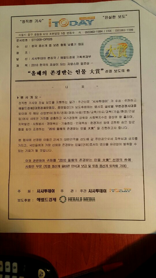 제목 토종 풍산개 올바른 인식과 보급 및 토착화 기여 한국의 존경받는 인물 대상 선정(한국풍산개종보존협회 대표: 남 홍 기 )